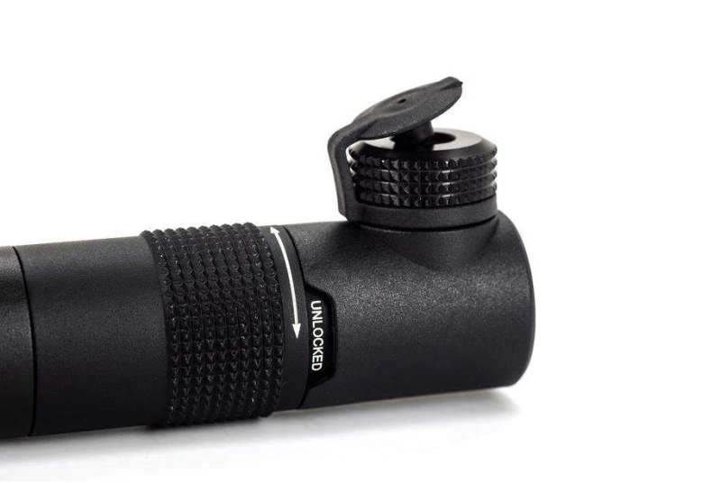 Pequeño Hinchador elaborado en Aluminio CNC con entrega de hasta 120 PSI, ideal para llevar tus neumáticos a punto, con capacidad para válvulas Presta y Schrader.