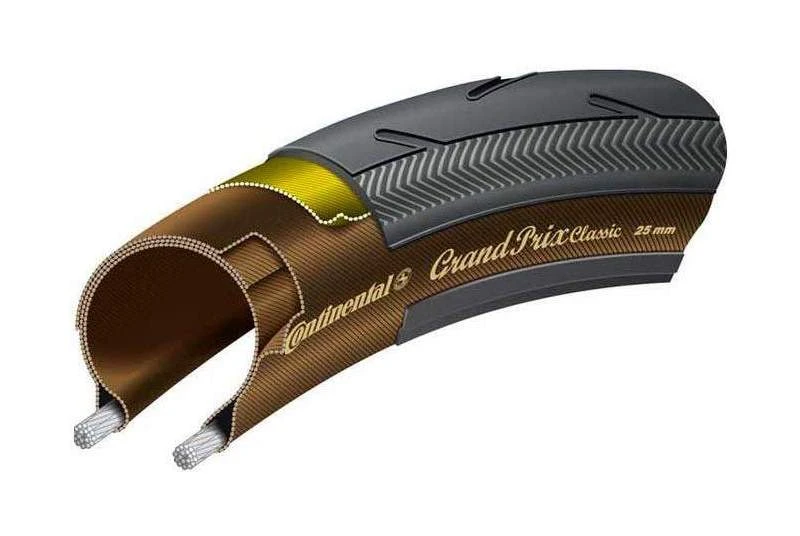 Las cubiertas Grand Prix Classic son igualmente elaboradas y con la misma tecnología que las Grand Prix normales, solo que cuentan con una estética más retro/clásica. Lleva los flancos del neumático en color marrón y su perfil de banda de rodamiento simula a las Conti Sport de 1982.