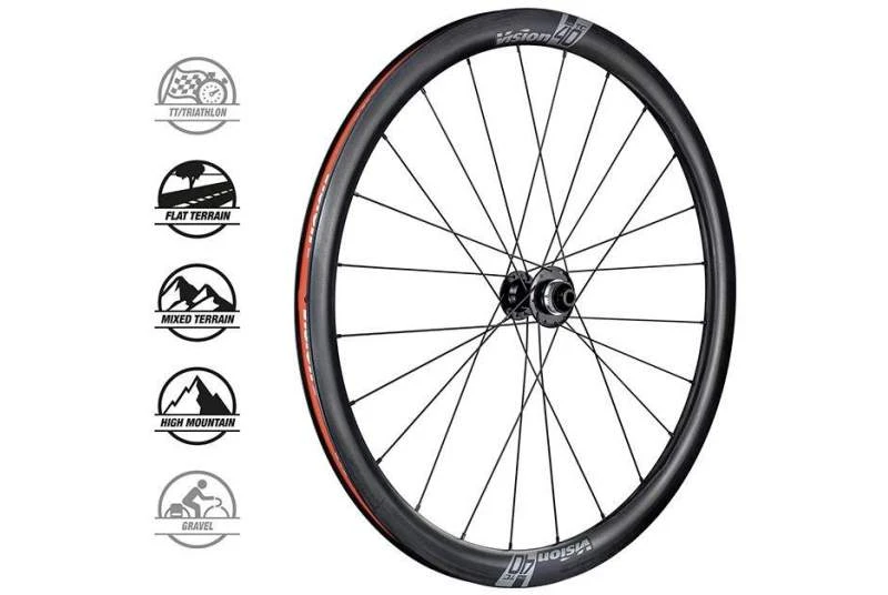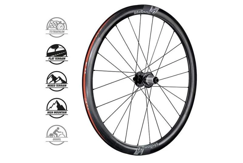 Vision TC 40 para freno de disco, ruedas para rendimiento en carretera. Idóneas para aquellos cuyo punto fuerte es el llano o les gusta montar ruedas con perfil alto, 55 mm en concreto, para llevar la bicicleta a velocidades de vértigo una vez que esta se encuentre lanzada.